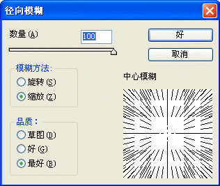 2.选择"滤镜"->"模糊"->"径向模糊",在出现的对话框中,我们设置如下图所示: