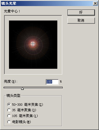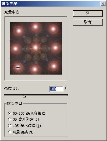 3.选择菜单命令“滤镜|渲染|镜头光晕”,在“镜头光晕”对话框中保持默认设置,通过单击“光晕中心”下方框中的中心点,将光晕设置在画布中心,如图所示: