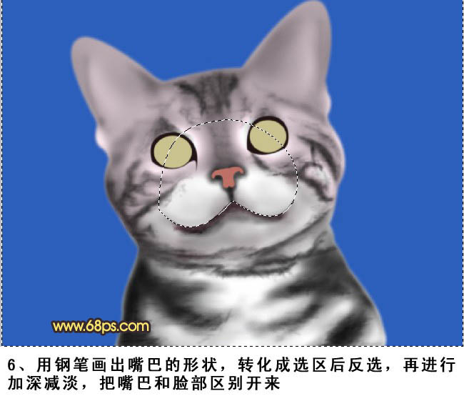 6、用钢笔画出嘴巴的形状,转化成选区后反选,再进行加深,减淡,把嘴巴和脸部区别开来。