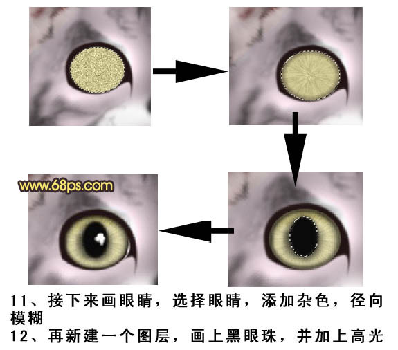 11、接下来画眼睛,选择眼睛,添加杂色,适当径向模糊。