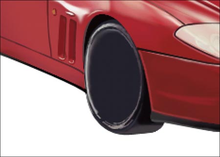 19.在刚才的层上面再新建一个层,用钢笔分别勾出轮胎的高光部分,转为选区,用画笔工具来抹出它的反光面,涂抹时注意灰跟白的变化,涂好后还是可以用模糊工具做柔和的处理。(图22)(图23)