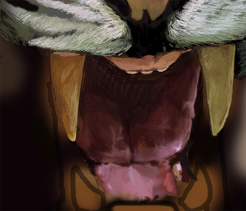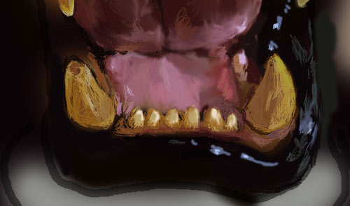 8、绘制牙齿我使用的方法是用素描的方式排线,在深色上面用一象素的毛笔勾画,舌头部分用雾化处理,以区别和牙齿坚硬的感觉: