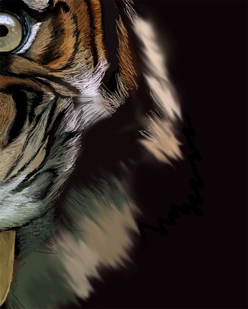 11、接下来就是画胡子了,只要有耐心就慢慢的画好了。实际上我在画的时候是想制造一些手工的效果,本来完全可以制作成照片一模一样的效果,我觉得意义不大,很不如直接用我觉得应该有些手工的痕迹又不影响整体。老虎的牙齿的确很焦黄,深硬也是我有意识的加强的,我觉得老虎的凶猛发怒就是体现在这些硬度的感觉上,以前学习绘画时花猫和画虎的区别就在一个圆和硬上面。个人意见和心得供参考!
