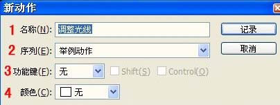 2、弹出的对话框,我们可以详细了解一下:名称:我们可以自定义给新建动作的名字;序列:指选择一个设置的目录;功能键:指我们可以任意对它进行设置快捷键;颜色:指对动作的分一种颜色,好区分的意思。