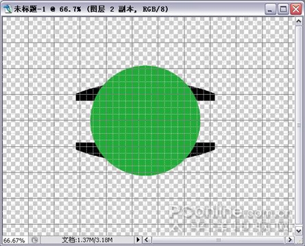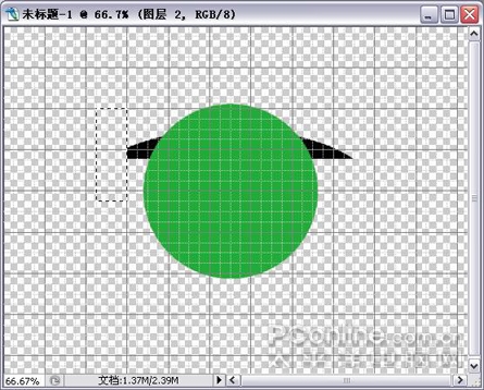 2. 在椭圆的图层上用矩形选框工具画出选区,把选区外的椭圆擦掉,点视图—显示--网格,用矩形选取左右两边的尖角擦掉。(图3)