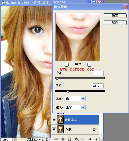 4、在特殊模糊对话框中调节各项的值,(本图使用的是默认值)。