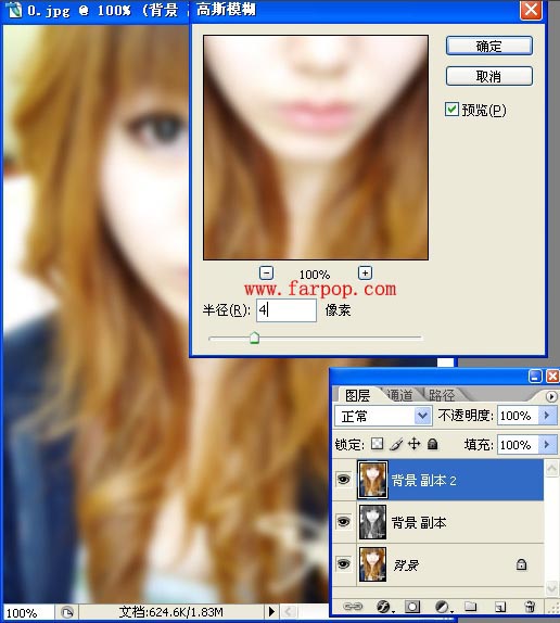8、将背景副本2图层前的眼睛点出来,然后在背景副本2图层中,选择菜单栏中的滤镜-->模糊-->高斯模糊. (本图半径值为4.你可以自己设定合适的值.)
