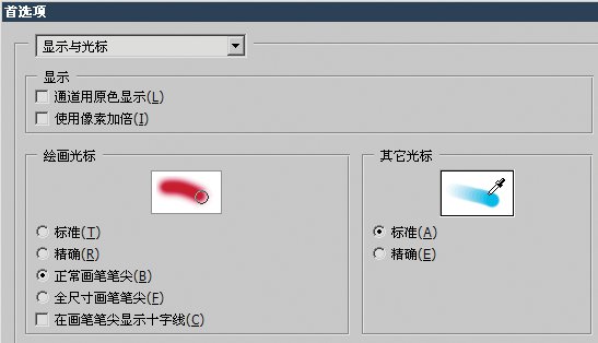 这时鼠标在图像中会变为笔刷大小的圆形,如果不是,首先确定键盘上的大小写转换键CapsLock处于关闭状态,然后从Photoshop首选项中的“显示与光标”项目中的“绘画光标”指定为“正常画笔笔尖”。如下图。