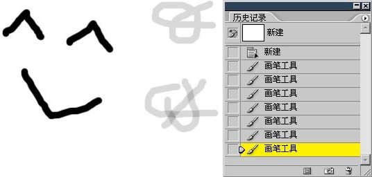 现在我们调出历史纪录调板,菜单【窗口 历史纪录】,会看到调板中纪录了这个图像新建以来所做过的所有操作步骤。顺序从上至下代表操作步骤的从先至今。如下右图。点击相应的步骤就可以回到那次操作之后图像的状态。就如同时光倒流般。这个历史纪录主要就是用来撤消操作的,如果对图像做了不满意的修改,可以通过这个调板来撤消。