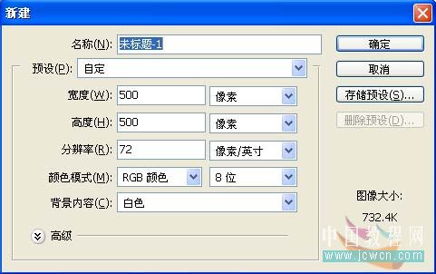 1、新建文件500*500PX,RGB,分辨率为72PX,背景为白色的文件。