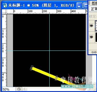 4、再次自由变换, 把图层1的中心点转移到参考线的中心交点上。如下图。并设置变换属性:角度为8度,按回车确定变形。