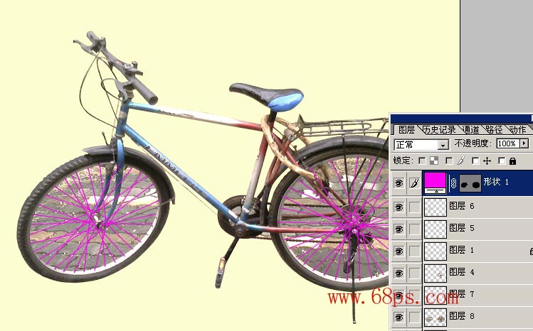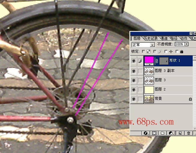 3.画钢线时,细心,加上用自己对单车的了解,感觉出大概,反正我们的目的只是让它抠出来后很逼真就形了.(这里为了突出,线条的颜色我用了比较鲜艳的颜色),描的直线如图4所示。完成的效果如图5