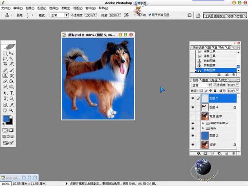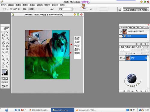 11)剩下的部分我采用橡皮擦工具直接涂抹.我是看了天师的方法的,这下可以派上用场了,狗尾巴的部分应该调低橡皮擦的不透明度(20%-30%左右吧),再剩下的部分比较好抠了.我就是用橡皮擦只调低一点(80%-90%)就可以涂了。 结果: