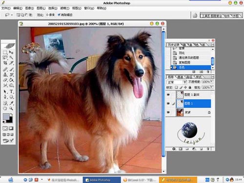 1)用Photoshop打开这张素材图,我们的任务是把狗从复杂背景中分离出来。