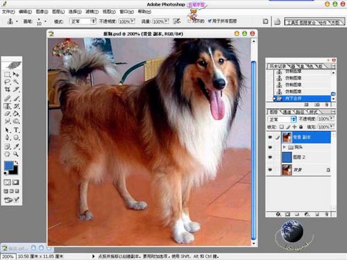 9)这样狗头部分就抠好了,下来就到狗的下半部分了,乍眼一看,的确不是纯背景,可是我们可以人为的创造出纯背景出来的,方法是用印章工具。