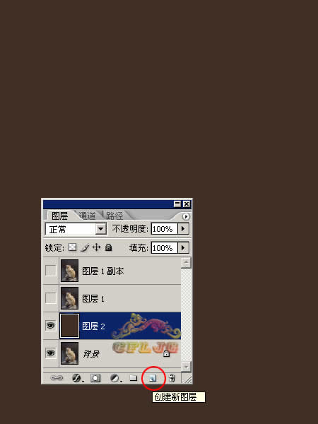2、点击红圈处,新建图层2放于图层1和背景层之间,作为检查效果和新的背景层,并填充颜色,为体现抠图后显示微细的毛丝效果,应尽量选择较深一点的颜色。
