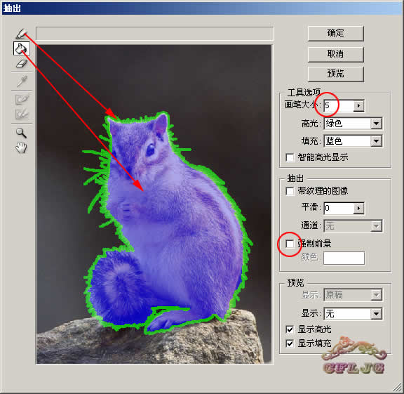3、在图层1执行滤镜--抽出命令,在强制前景处打勾,颜色定为白色,用高光器工具涂抹绿色,中间大面积处可用大一点的笔触,主体外的胡须部分可用小一点的笔触,这里选择5。