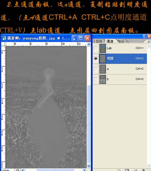 2、点通道面板。选择a通道,复制粘贴到明度通道(点a通道按Ctrl + A 全选,按Ctrl + C 复制,点明度通道按Ctrl + V 粘贴)。点Lab通道,然后回到图层面板。