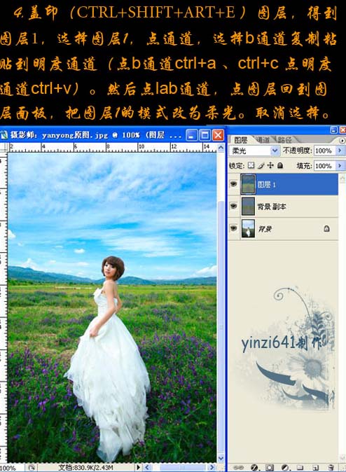 4、新建一个图层,按Ctrl + Alt + Shift + E 盖印图层。得到图层1,选择图层1,点通道面板,选择b通道复制粘贴到明度通道(方法:点b通道,按Ctrl + A 全选,按Ctrl + C 复制,点明度通道,按Ctrl + V 粘贴。)。然后点Lab通道,再回到图层面板,把图层1的图层混合模式改为“柔光”。