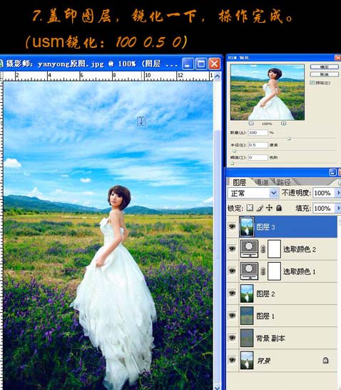 7、新建一个图层,盖印图层,执行:滤镜 > 锐化 > USM锐化,数值:100/.5/0,确定后,完成最终效果。