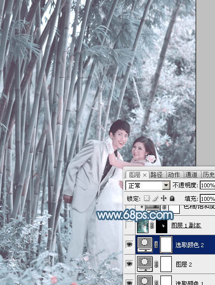 Photoshop打造梦幻淡调青蓝色的竹林婚纱照片调色教程