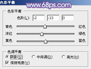 3、创建色彩平衡调整图层对阴影,中间调进行调整,参数设置如图8,9,效果如图10。这一步给图片增加蓝紫色。