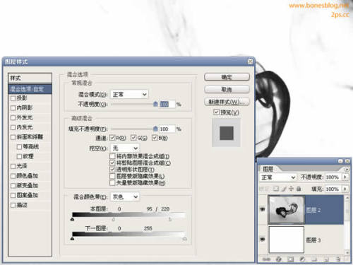 7、我们打开图层2的混合选项,在图层样式对话框中,调整“混合颜色带”