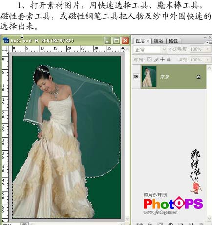 1、打开原图素材,用快速选择工具如魔术棒,磁性套索,或磁性钢笔工具把人物及纱巾外围快速的选择出来。