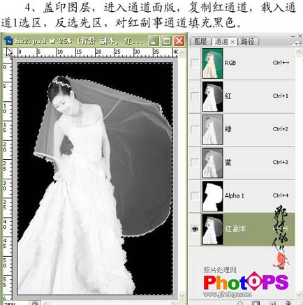 4、新建一个图层,按Ctrl + Alt + Shift + E盖印图层,进入通道面板,复制红色通道,载入通道1选区,按Ctrl + Shift + I反选选区,对红副本填充黑色。