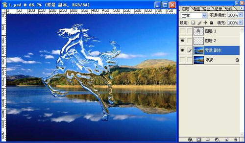 6、回到背景副本图层,按住CTRL键点击图层1获得马的轮廓选区,反选,用历史画笔沿着马的轮廓边缘擦涂,将刚才因玻璃滤镜扭曲过度的部分擦去。