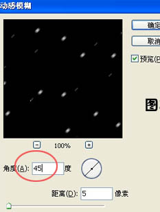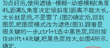 3、点好白点后,执行:滤镜 > 模糊 > 动感模糊,角度为45,距离为5如图2.距离不能太长,太长就是雨不是雪了。确定后回到图层,把图层模式改为“滤色”如图3。跟着是很关键的一步,按Ctrl + T 选中黑色层,同时按住Shift + Alt 键把黑色图层等比放到,如图4所示,然后按回车确认。