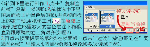c、再点帧面板层的第二帧,在帧面板上点击“过渡”按钮如图5,在“要添加的帧”里输入4,添加4帧,如图8,帧越多过渡越自然。