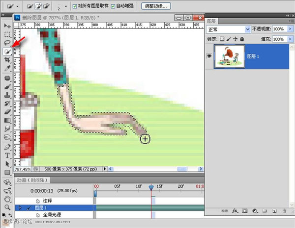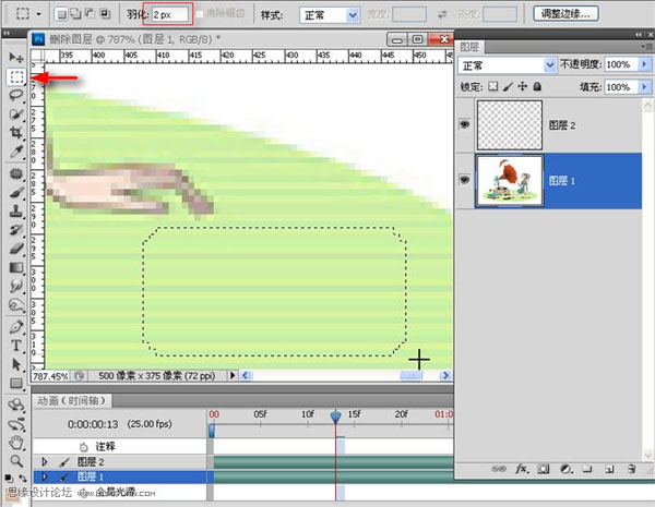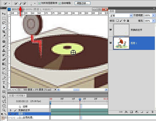 2、ps里打开,用“套索工具”和“仿制图章”等工具,去掉原图中的音符。然后,打开动画面板(时间轴),单击箭头所指小三角>文档设置>设定时间及帧数。这里设为2秒,每秒25帧。