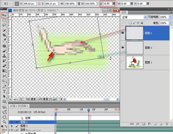 5、ctrl+J,得到图层3;“移动工具”下,将图层3置于原图手部位置,调整至合适,然后参考图示,移动参考点至红色箭头所指处,逆时针旋转9度左右,使手看起来有种抬起的感觉。