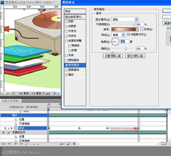 27、时间指示器移至时间轴的四分之一处,双击红框所示处的“渐变叠加”>“角度”旋转至0度,确定。