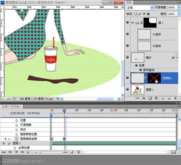 到这里,顺便说一下,时间轴支持“不透明度”和“启用蒙版”,可是,它对关闭图层却不支持。所以,我们添加蒙版也是无奈,但,它用起来却很方便。时间指示器移至某一位置(此编辑凭感觉,没有固定位置),按住SHIFT键,单击蒙版——可以使蒙版在“启用和停用”之间转换。
