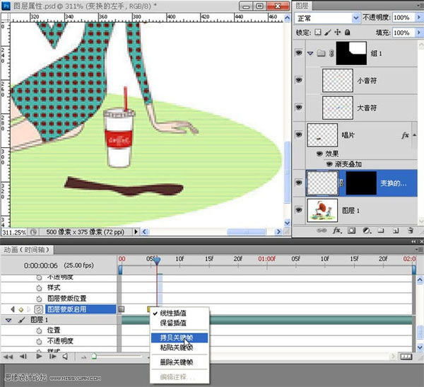 30、最后一个动作。为了尽可能多的加入动态元素,我觉着让人物的手跟着音乐一起动起来应该是即能达到好的效果又是最简单的方法,所以,我们复制并将人物的手做了相应的变化。