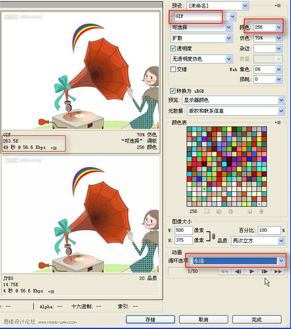 上方红框根据文件体积大小可以降低颜色数等。左边红框为文件效果和大小预览,263K不算大,播放应该很流畅。