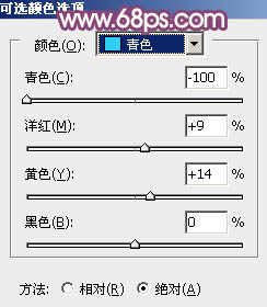 1、打开素材图片,创建可选颜色调整图层,对黄、绿、青进行调整,参数设置如图1 - 3,效果如图4。这一步给图片增加橙红色。