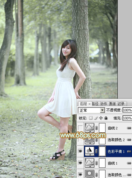 Photoshop调出淡黄绿色效果的树林美女照片调色教程