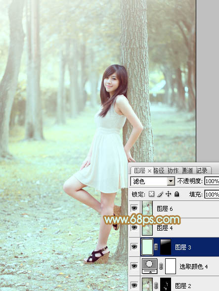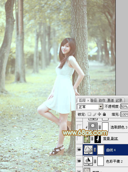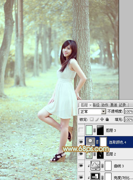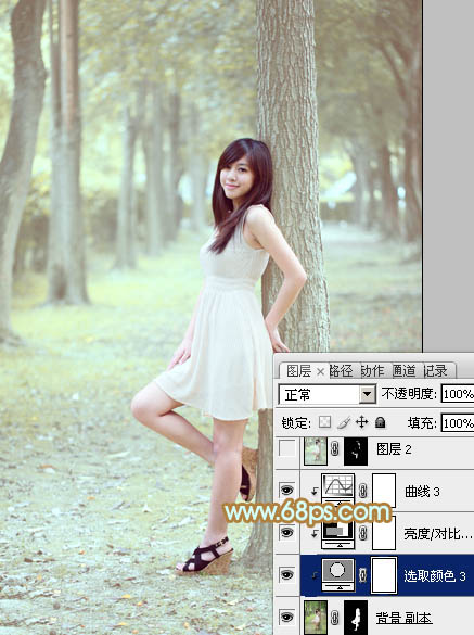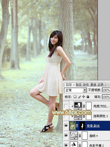 Photoshop调出淡黄绿色效果的树林美女照片调色教程