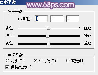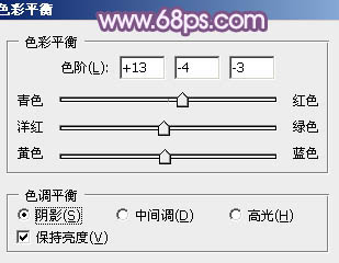 4、创建色彩平衡调整图层,对阴影、中间调、高光进行调整,参数设置如图10 - 12,效果如图13。这一步给图片暗部及高光部分增加蓝紫色。