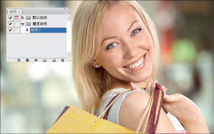 2、用动作进行磨皮。(点击此处下载磨皮动作)执行窗口\ 动作,单击【动作】面板右上角的三角按钮,选择【载入动作】。