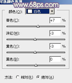 8、创建可选颜色调整图层,对黄、蓝、白进行调整,参数设置如图32 - 34,效果如图35。这一步加强图片中的暖色。