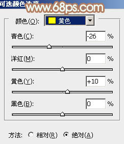 1、打开素材图片,创建可选颜色调整图层,对黄色进行调整,参数及效果如下图。这一步先把图片中的黄色与绿色色差拉大。