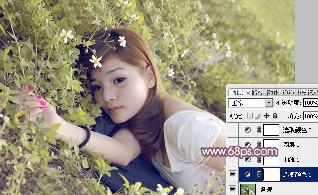 1、打开素材图片,创建可选颜色调整图层,对黄、绿、黑进行调整,参数设置如图1 - 3,效果如图4。这一步把背景主色转为黄褐色。