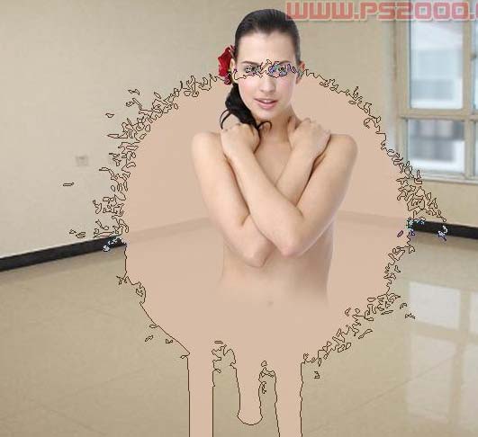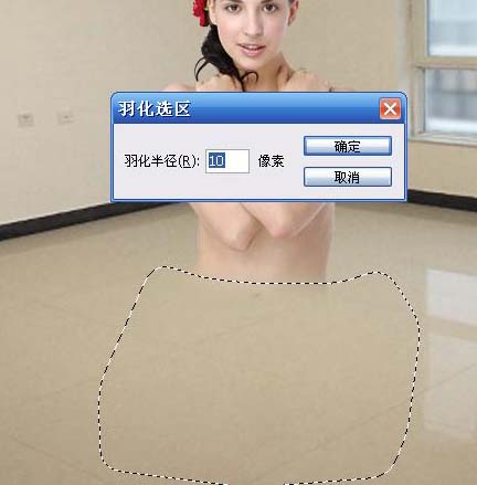 2、在人物图层,用套索工具选取人物下部分选区,如下图,按Ctrl + Alt + D羽化10像素后删除。