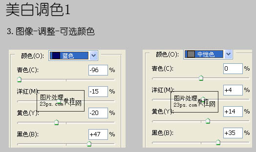 3、选择菜单:图像 > 调整 > 可选颜色,参数设置如下图。