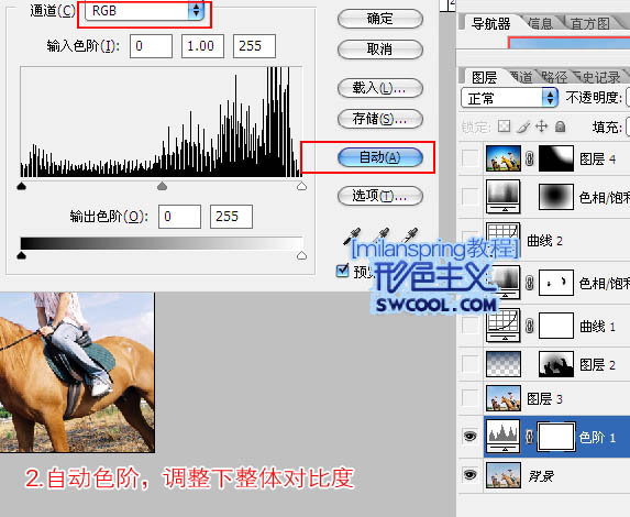 2、创建色阶调整图层,选择RGB通道,再点面板右边的“自动”按钮,调整一下整体对比度。