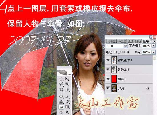 1、打开原图,按Ctrl + J把背景复制一层,用钢笔或套索工具抠出人和伞,在背景图层上面新建一个图层,填充红色以便观察。